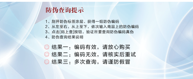 关注微信公众号:, 回复“防伪编码”查询真伪。